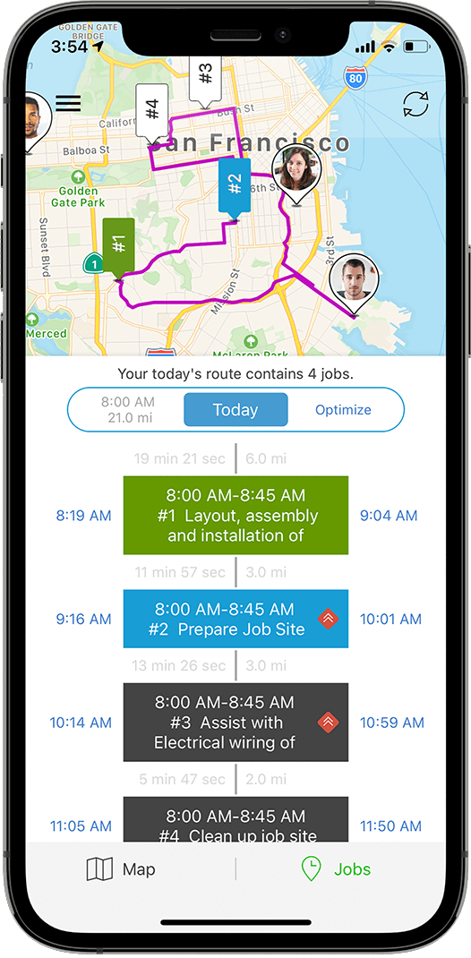 Schedule and assign jobs to employees. Click here to learn more about smart job dispatching and one-click route optimization.
