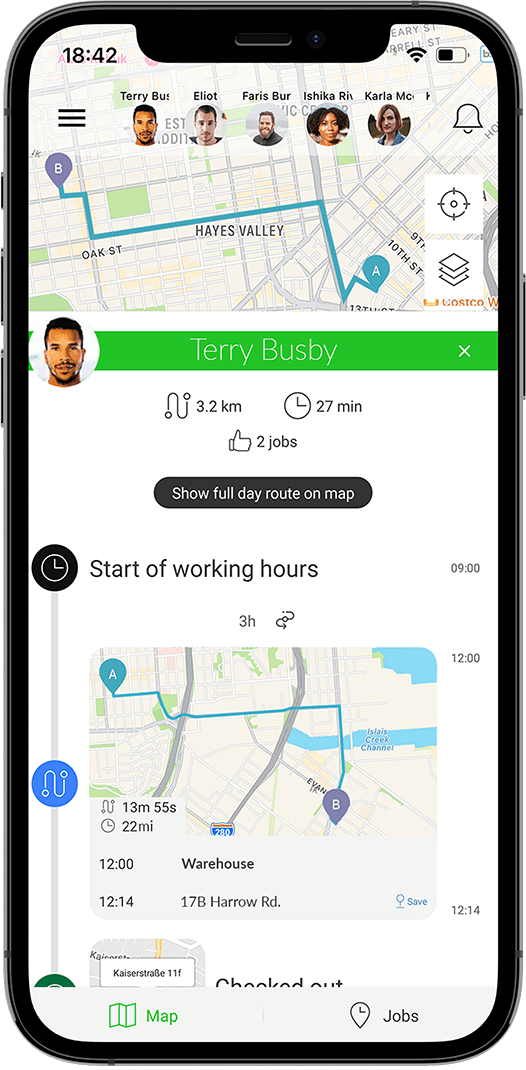 Hellotracks GPS software does the work for you. At any time, you can pinpoint your employees’ exact location, average and maximum speed and timed breaks. All trips and day routes are registered as long as you define.