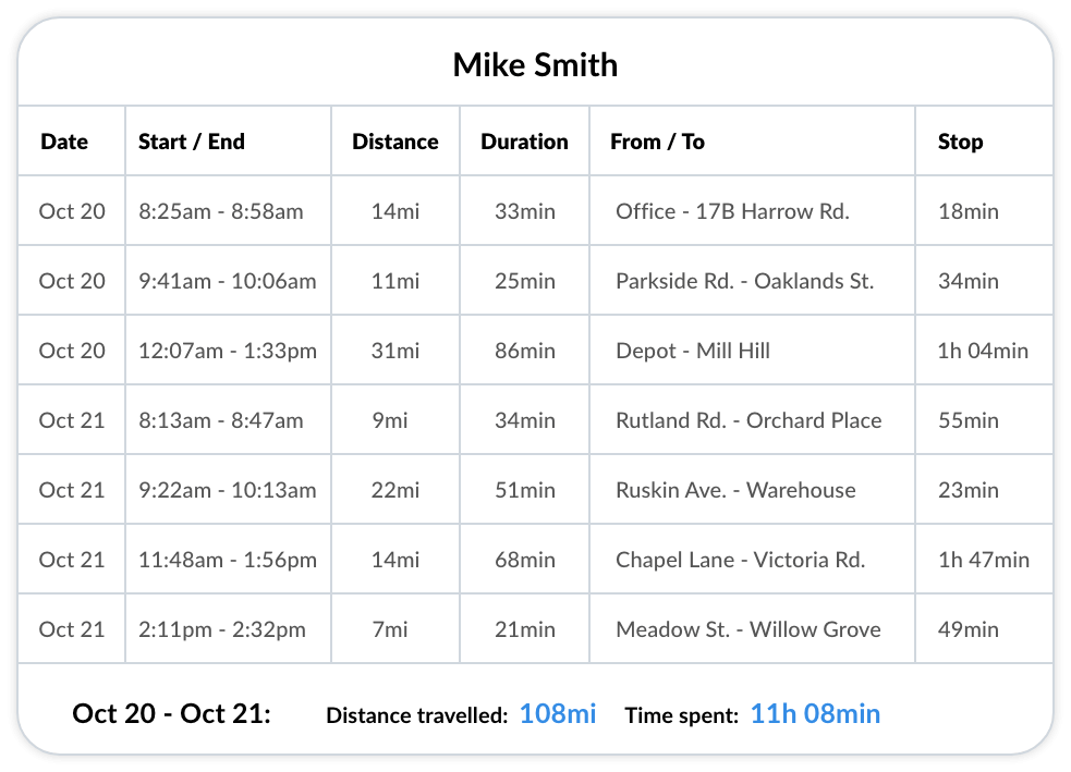 Mileage Reports made easy with exact start/end addresses, mileage, duration, and pause recording.